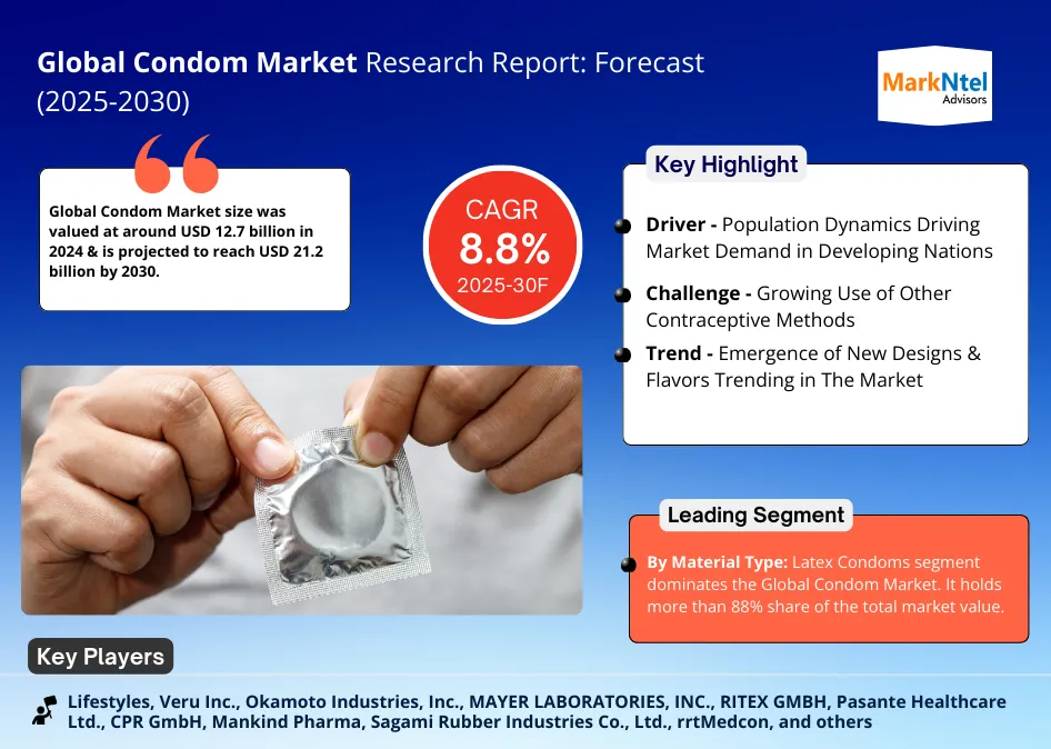 According to MarkNtel Advisors study The future of Condom Market size was valued at around USD 12.7 billion in 2024 and is projected to reach USD 21.2 billion by 2030. Along with this, the market is estimated to grow at a CAGR of around 8.8% during the forecast period (2025-30).