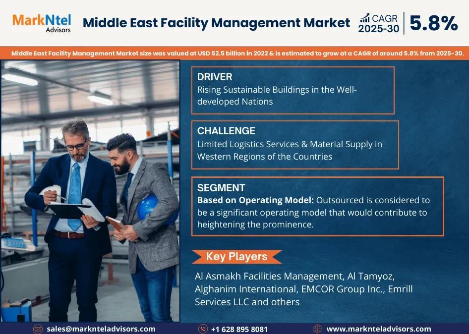 As per recent study by Markntel Advisors The Middle East Facility Management Market size was valued at USD 52.5 billion in 2022 & is estimated to grow at a CAGR of around 5.8% during the forecast period, i.e., 2025-30.