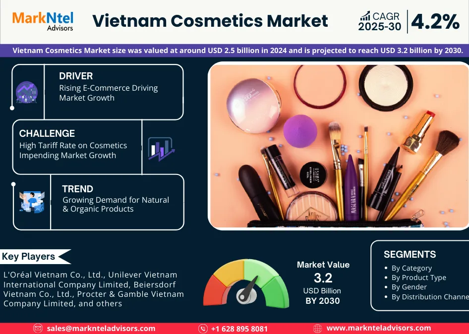 According to MarkNtel Advisors study The future of Vietnam Cosmetics Market size was valued at around USD 2.5 billion in 2024 and is projected to reach USD 3.2 billion by 2030. Along with this, the market is estimated to grow at a CAGR of around 4.2% during the forecast period, i.e., 2025-30.