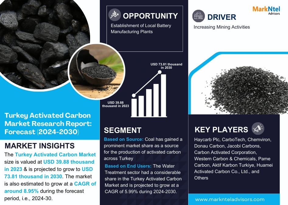 According to MarkNtel Advisors study The future of Turkey Activated Carbon Market size is valued at USD 39.88 thousand in 2023 & is projected to grow to USD 73.81 thousand in 2030. The market is also estimated to grow at a CAGR of around 8.95% during the forecast period, i.e., 2024-30.