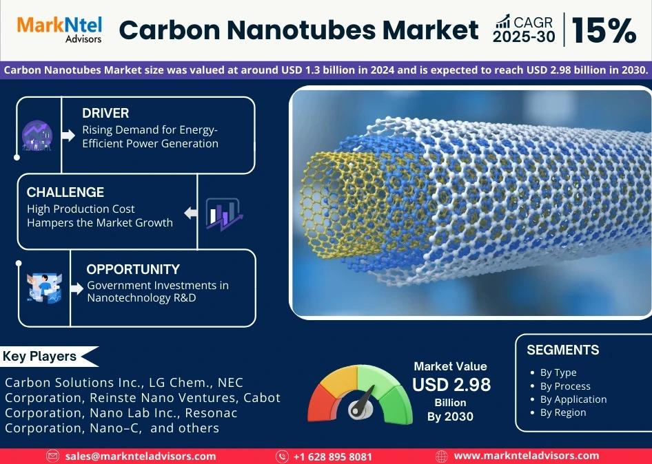 As per recent study by Markntel Advisors The Global Carbon Nanotubes Market size was valued at around USD1.3 billion in 2024 and is expected to reach USD2.98 billion in 2030. Along with this, the market is estimated to grow at a CAGR of around 15% during the forecast period, i.e., 2025-30.