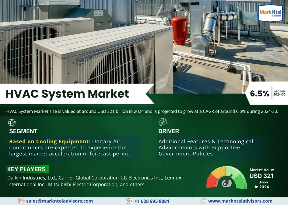 According to MarkNtel Advisors study The future of HVAC System Market size is valued at around USD 321 billion in 2024 and is projected to grow at a CAGR of around 6.5% during the forecast period, i.e., 2024-30.