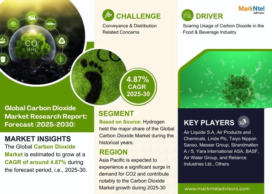 As per recent study by Markntel Advisors The Global Carbon Dioxide Market is estimated to grow at a CAGR of around 4.87% during the forecast period, i.e., 2025-30