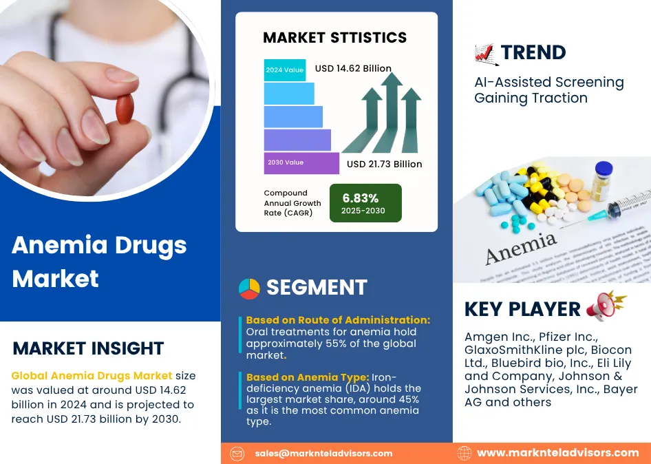According to MarkNtel Advisors study The future of Anemia Drugs Market size was valued at around USD 14.62 billion in 2024 and is projected to reach USD 21.73 billion by 2030. Along with this, the market is estimated to grow at a CAGR of around 6.83% during the forecast period, i.e., 2025-30.