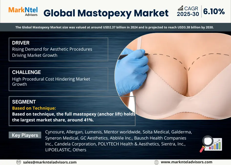 According to MarkNtel Advisors study The future of Mastopexy Market size was valued at around USD2.37 billion in 2024 and is projected to reach USD3.38 billion by 2030. Along with this, the market is estimated to grow at a CAGR of around 6.10% during the forecast period, i.e., 2025-30.