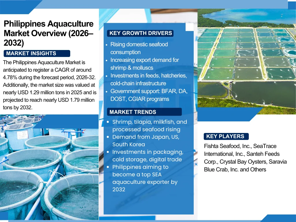 According to the latest report by The Reports Cube insights The Philippines Aquaculture Market is anticipated to register a CAGR of around 4.78% during the forecast period, 2026-32. Additionally, the market size was valued at nearly USD 1.29 million tons in 2025 and is projected to reach nearly USD 1.79 million tons by 2032.