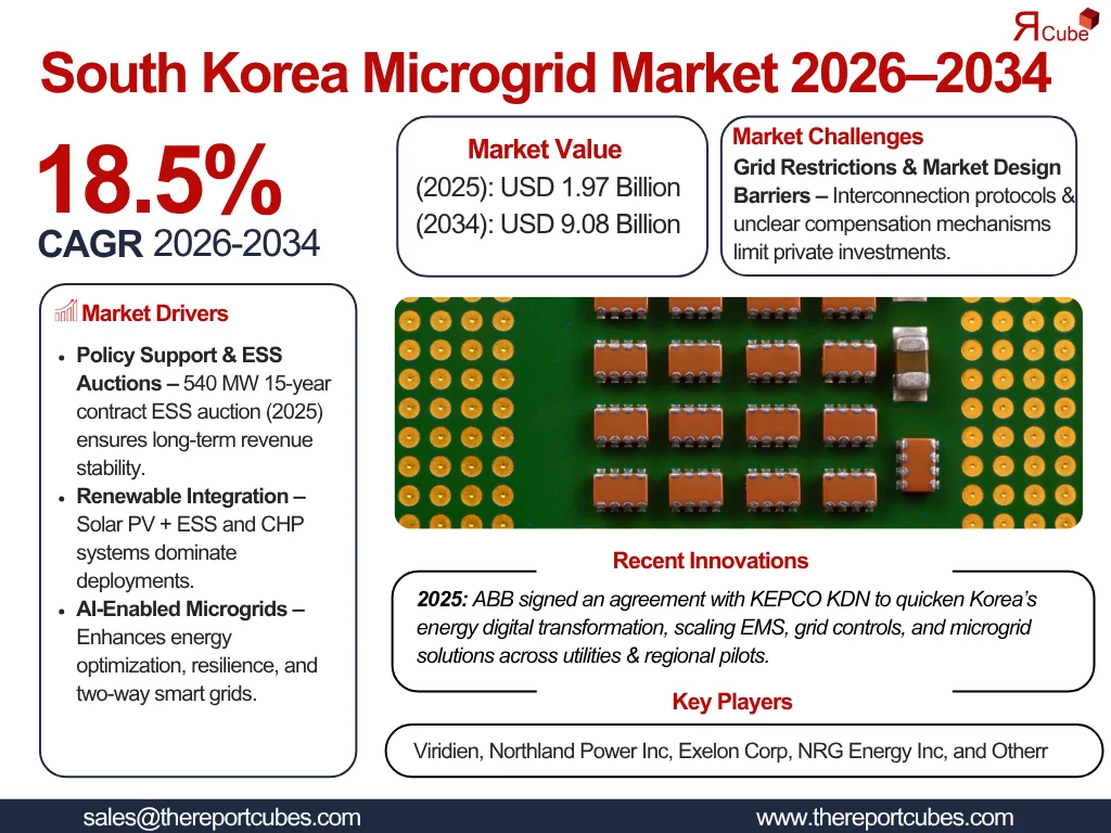 According to the latest report by The Report Cube, study South Korea Microgrid Market is anticipated to register a CAGR of around 18.5% during the forecast period, 2026-34. Additionally, the market size was valued at nearly USD 1.97 billion in 2025 and is projected to reach nearly USD 9.08 billion by 2034.