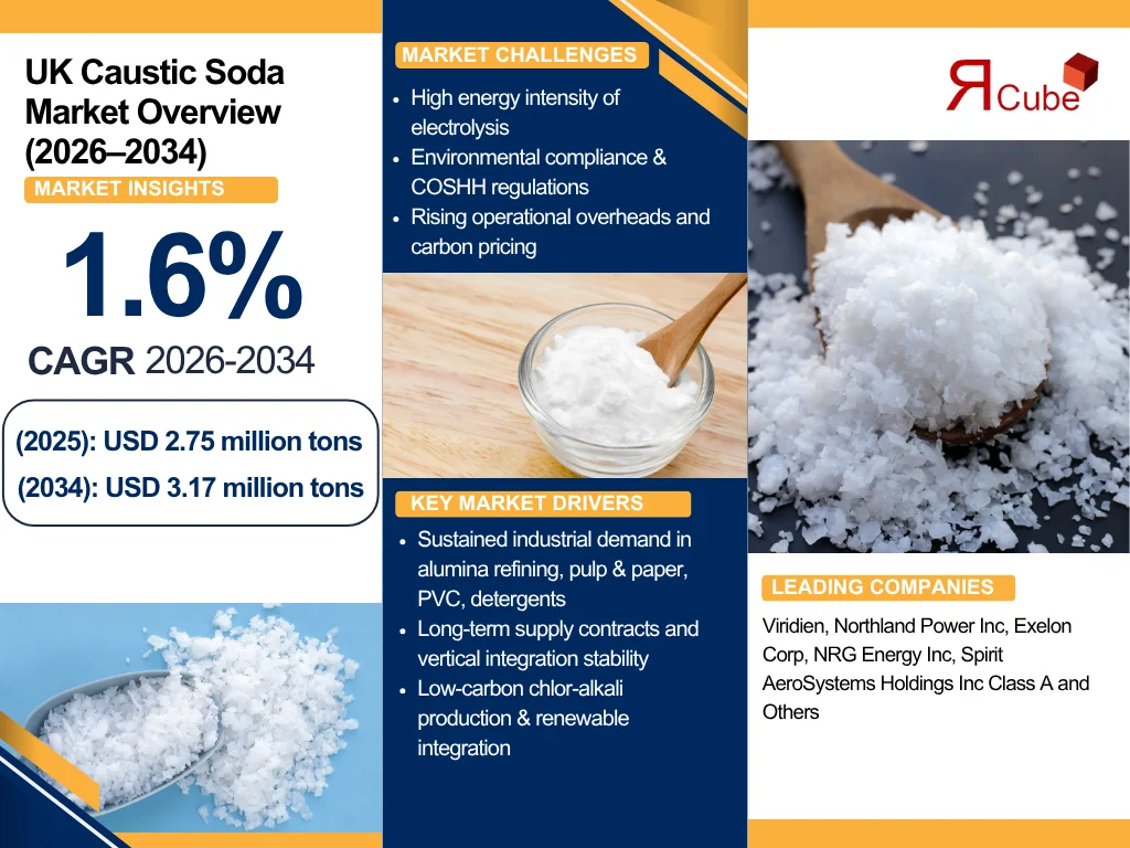 According to the latest report by The Report Cube, study UK Caustic Soda Market is anticipated to register a CAGR of around 1.6% during the forecast period, 2026-34. Additionally, the market size was valued at nearly USD 2.75 million tons in 2025 and is projected to reach nearly USD 3.17 million tons by 2034.