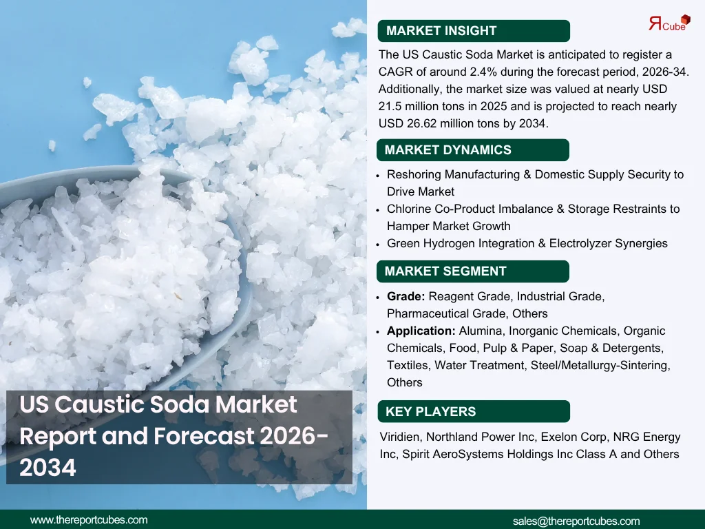 According to the latest report by The Report Cube, study US Caustic Soda Market is anticipated to register a CAGR of around 2.4% during the forecast period, 2026-34. Additionally, the market size was valued at nearly USD 21.5 million tons in 2025 and is projected to reach nearly USD 26.62 million tons by 2034.