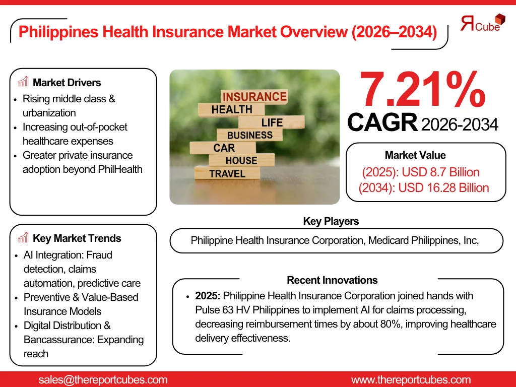 According to the latest report by The Report Cube, study Philippines Health Insurance Market is anticipated to register a CAGR of around 7.21% during the forecast period, 2026-34. Additionally, the market size was valued at nearly USD 8.7 billion in 2025 and is projected to reach nearly USD 16.28 billion by 2034.