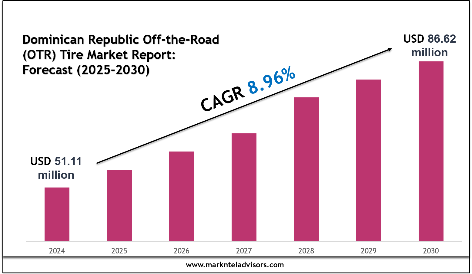 As per MarkNtel Advisors the Dominican Republic OTR Tire Market size was valued at around USD51.11 million in 2024 and is projected to reach USD86.62 million by 2030. Along with this, the market is estimated to grow at a CAGR of around 8.96% during the forecast period, i.e., 2025-30.