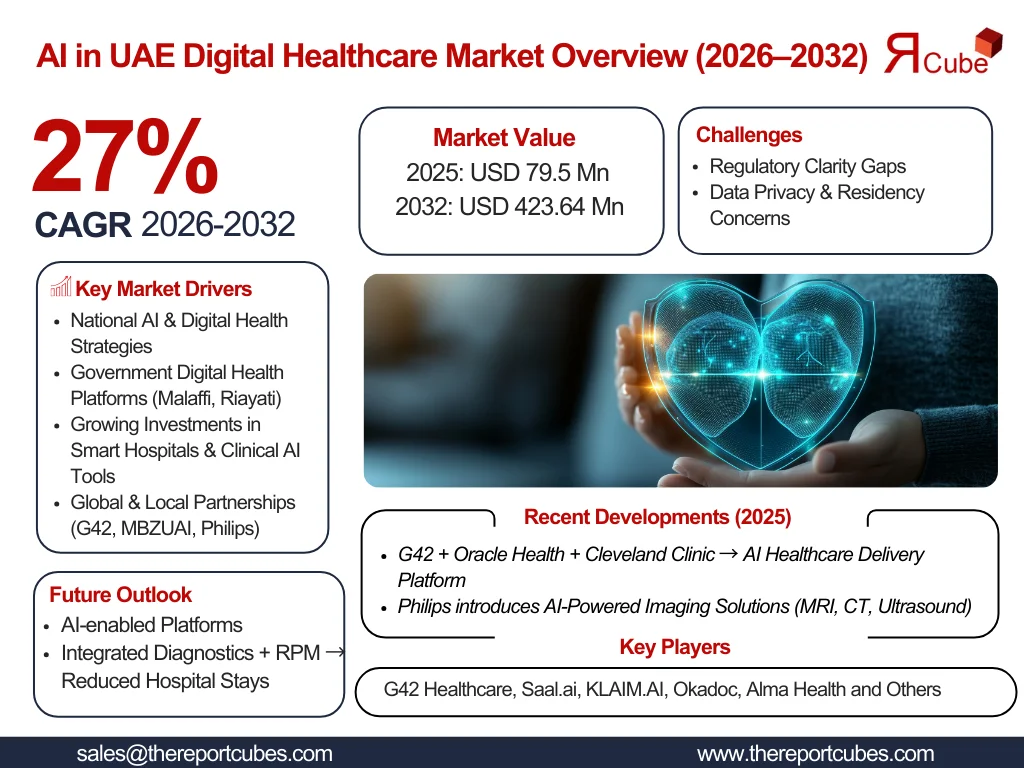 According to the latest report by The Report Cube, study AI in UAE Digital Healthcare Market is anticipated to register a CAGR of around 27% during the forecast period, 2026-32. Additionally, the market size was valued at nearly USD 79.5 million in 2025 and is projected to reach nearly USD 423.64 million by 2032.