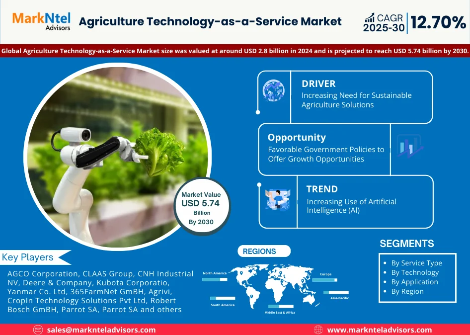 As per MarkNtel Advisors the Agriculture Technology-as-a-Service Market size was valued at around USD 2.8 billion in 2024 and is projected to reach USD 5.74 billion by 2030. Along with this, the market is estimated to grow at a CAGR of around 12.70% during the forecast period, i.e., 2025-30.