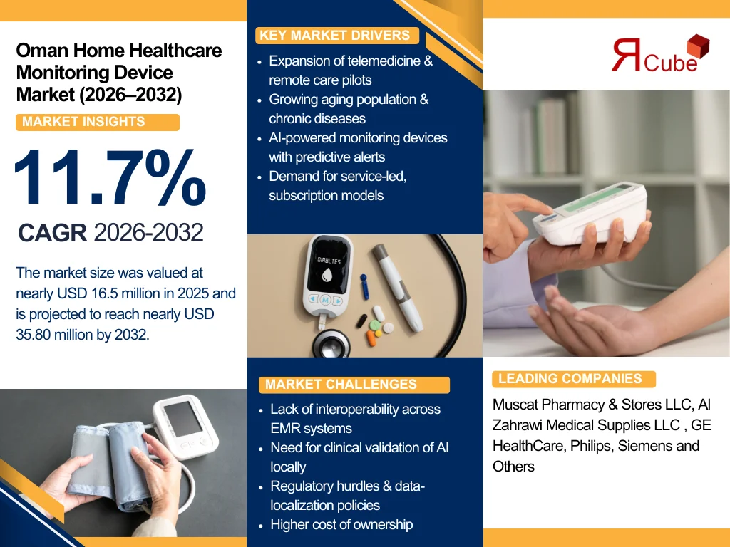 According to the latest report by The Report Cube, study Oman Home Healthcare Monitoring Device Market is anticipated to register a CAGR of around 11.7% during the forecast period, 2026-32. Additionally, the market size was valued at nearly USD 16.5 million in 2025 and is projected to reach nearly USD 35.80 million by 2032.