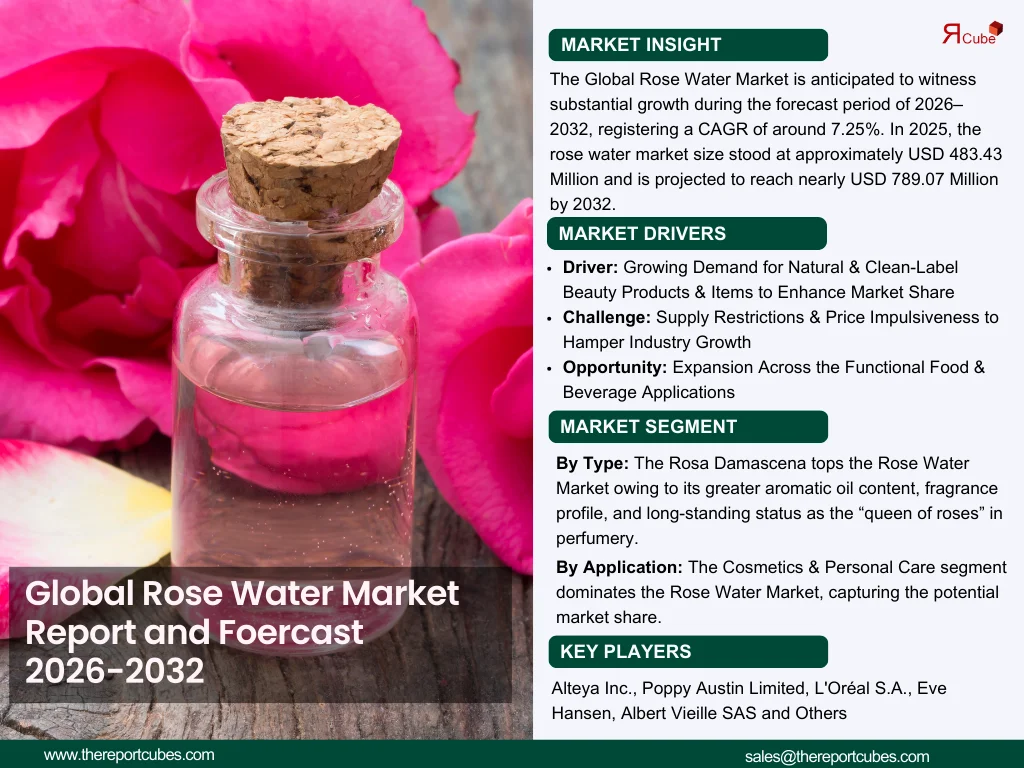 According to the latest report by The Reports Cube insights The Global Rose Water Market is anticipated to witness substantial growth during the forecast period of 2026–2032, registering a CAGR of around 7.25%. In 2025, the rose water market size stood at approximately USD 483.43 Million and is projected to reach nearly USD 789.07 Million by 2032. This growth trajectory is motivated by the surging preference for natural, herbal, and plant-based products & items across the wellness, food, beauty, and pharmaceutical sectors.