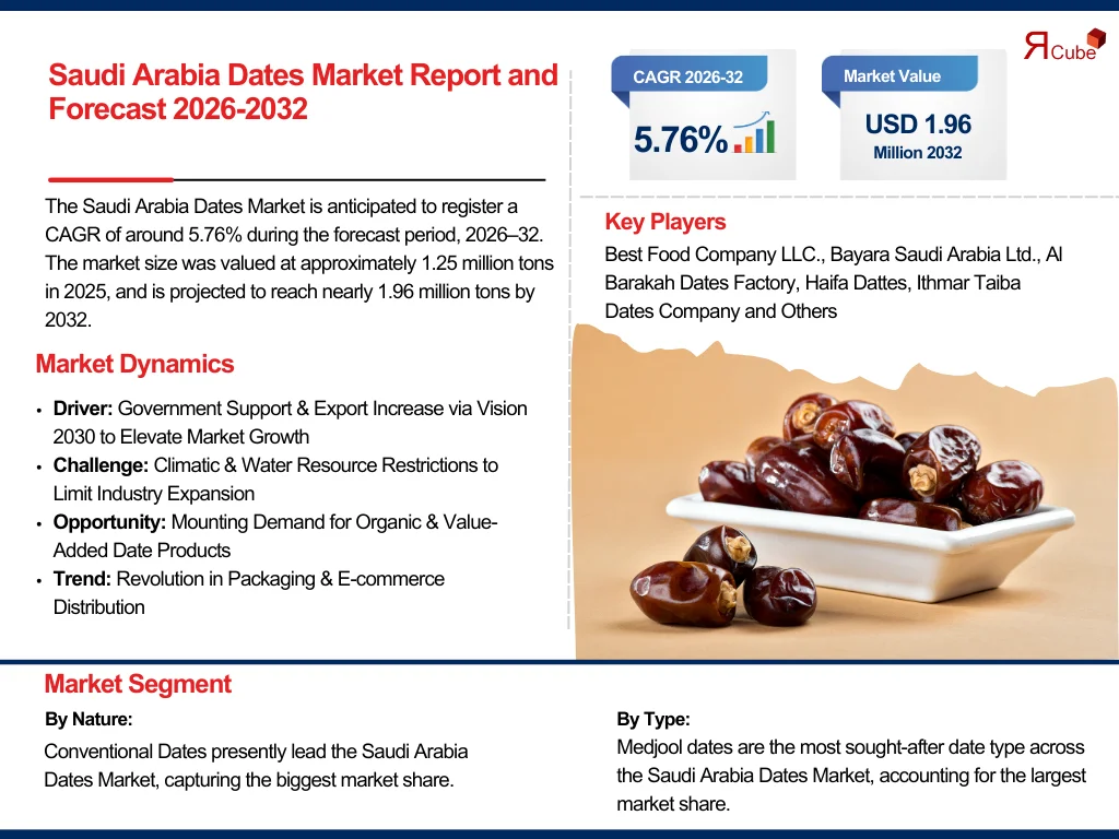 According to the latest report by The Report Cube, study Saudi Arabia Dates Market is anticipated to register a CAGR of around 5.76% during the forecast period, 2026–32. The market size was valued at approximately 1.25 million tons in 2025, and is projected to reach nearly 1.96 million tons by 2032.