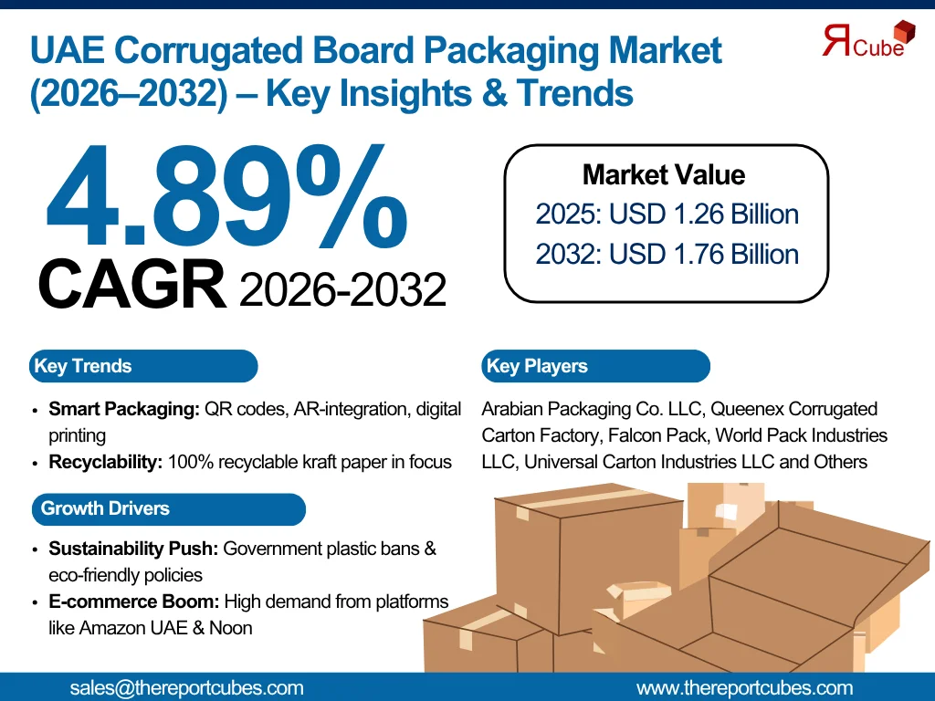 According to the latest report by The Report Cube, study UAE Corrugated Board Packaging Market is anticipated to register a CAGR of around 4.89% during the forecast period, 2026–32. The market size was valued at nearly USD 1.26 billion in 2025, and is projected to reach approximately USD 1.76 billion by 2032.