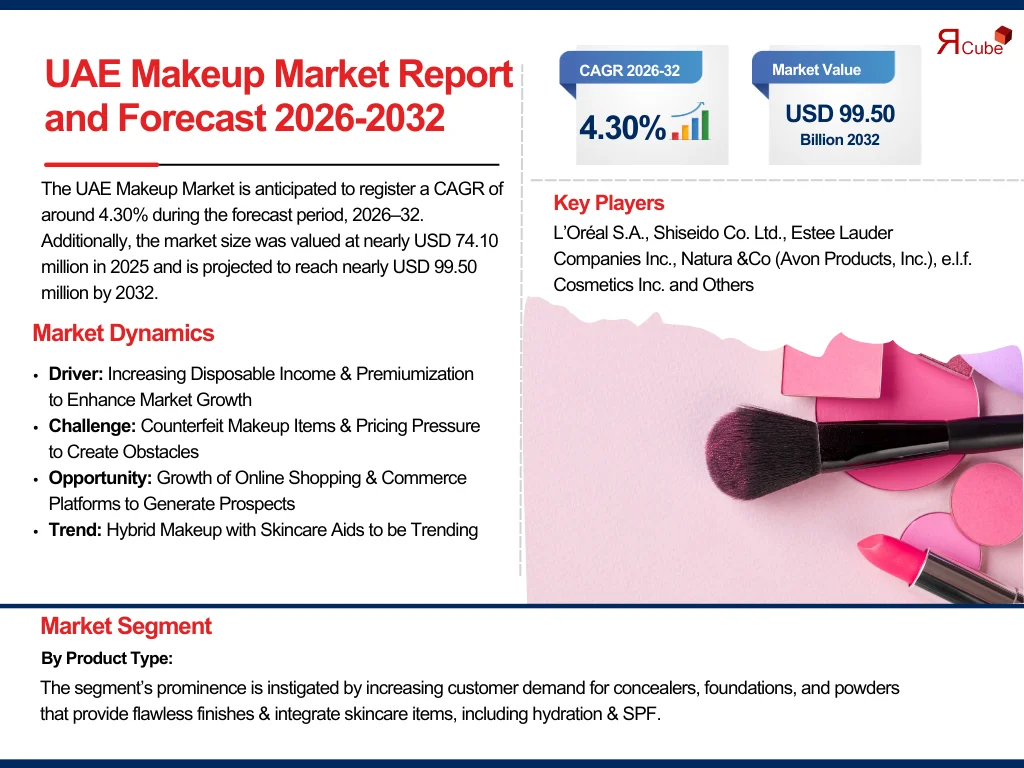 According to the latest report by The Reports Cube insights The UAE Makeup Market is anticipated to register a CAGR of around 4.30% during the forecast period, 2026–32. Additionally, the market size was valued at nearly USD 74.10 million in 2025 and is projected to reach nearly USD 99.50 million by 2032.