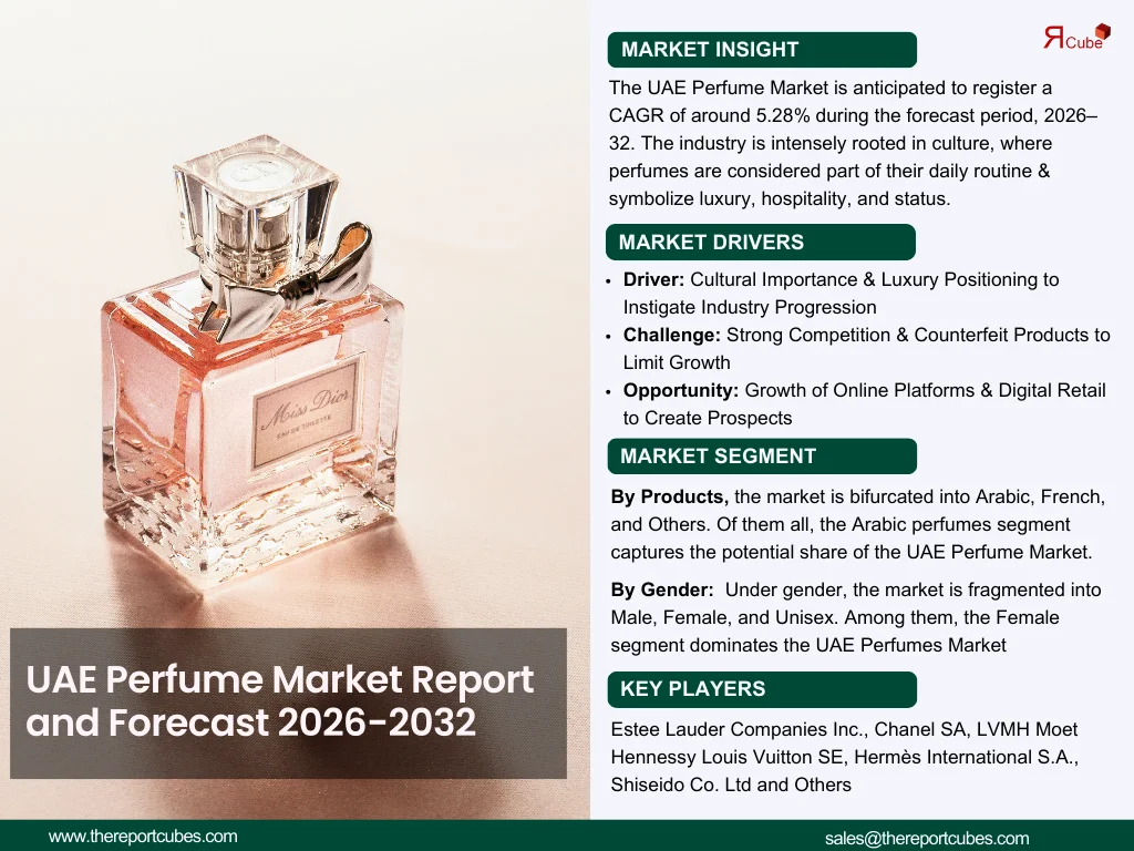 According to the latest report by The Reports Cube insights The UAE Perfume Market is anticipated to register a CAGR of around 5.28% during the forecast period, 2026–32. The market size was valued at nearly USD 1366.4 million in 2025 and is foreseen to reach USD 1958.84 million by 2032.