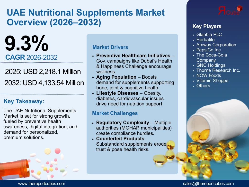 According to the latest report by The Report Cube, study UAE Nutritional Supplements Market is projected to witness lucrative growth at a steady CAGR of 9.3% during the forecast period, i.e., 2026-32. Additionally, the market size was valued at nearly USD 2218.1 million in 2025 and is projected to reach nearly USD 4133.54 million by 2032.