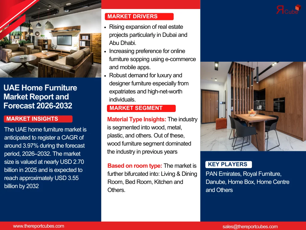 According to the latest report by The Reports Cube insights The UAE home furniture market is anticipated to register a CAGR of around 3.97% during the forecast period, 2026–2032. The market size is valued at nearly USD 2.70 billion in 2025 and is expected to reach approximately USD 3.55 billion by 2032