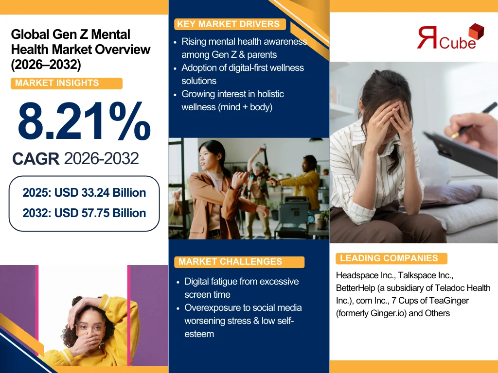 According to the latest report by The Report Cube, study Gen Z Mental Health Market is predicted to register a CAGR of around 8.21% during the forecast period, 2026–2032. Additionally, the market size was valued at nearly USD 33.24 billion in 2025 and is projected to reach nearly USD 57.75 billion by 2032.