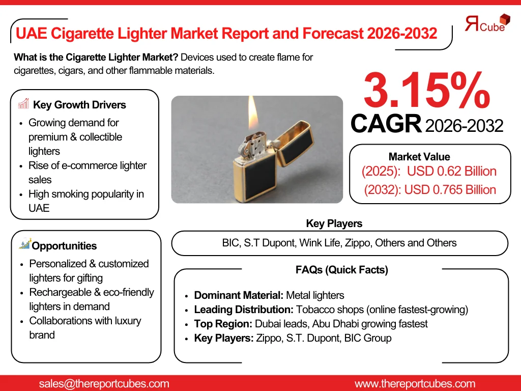 According to the latest report by The Reports Cube insights The UAE Cigarette Lighter market is anticipated to register a CAGR of around 3.15% during the forecast period, 2026-32. Also, the market size was valued at nearly USD 0.62 billion in 2025 and is foreseen to witness nearly USD 0.765 billion during 2032.