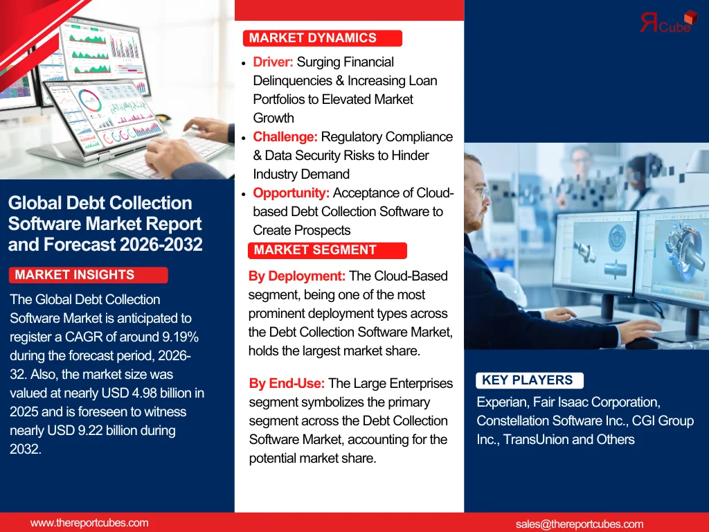 According to the latest report by The Reports Cube insights The Global Debt Collection Software Market is anticipated to register a CAGR of around 9.19% during the forecast period, 2026-32. Also, the market size was valued at nearly USD 4.98 billion in 2025 and is foreseen to witness nearly USD 9.22 billion during 2032.