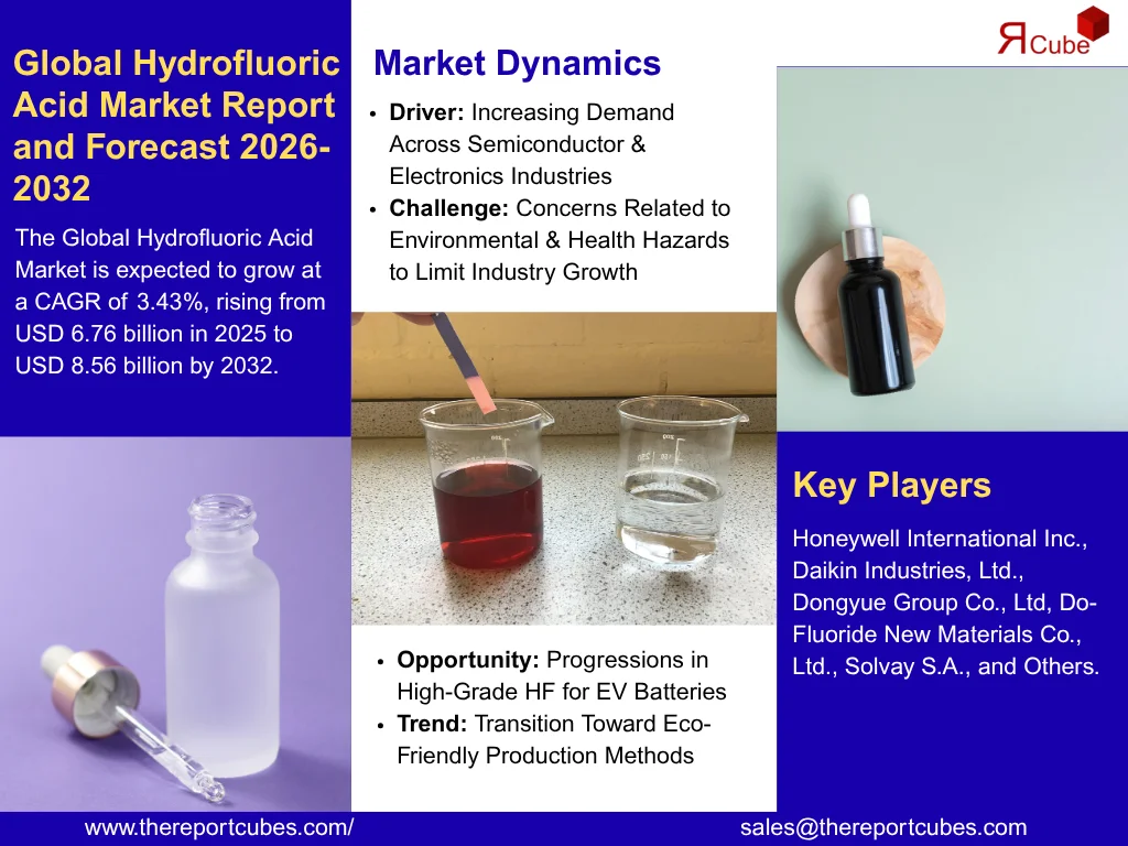 According to the latest report by The Report Cube, study Hydrofluoric Acid Market is anticipated to register a CAGR of around 3.43% during the forecast period, 2026–32. The hydrofluoric acid market size is valued at nearly USD 6.76 billion in 2025 and is projected to reach approximately USD 8.56 billion by 2032. The industry progression is compelled by its increasing demand in numerous industrial applications like glass etching, oil refining, metal pickling, and the making of fluorinated derivatives. Hydrofluoric acid (HF), derived from hydrogen fluoride, is an extremely reactive & corrosive compound that is broadly used in both anhydrous & diluted forms.