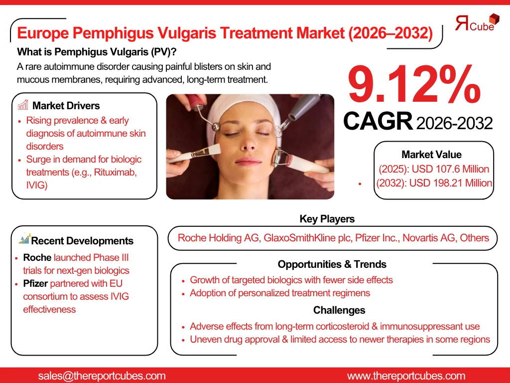 According to the latest report by The Report Cube, study Europe Pemphigus Vulgaris Treatment Market is anticipated to register a CAGR of around 9.12% during the forecast period, 2026-32. Also, the market size is valued at nearly USD 107.6 million in 2025 and is foreseen to witness nearly USD 198.21 million during 2032.