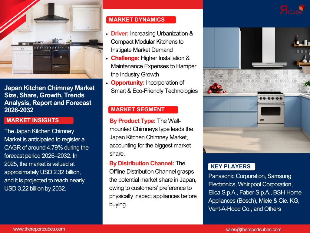 According to the latest report by The Report Cube, study Japan Kitchen Chimney Market is anticipated to register a CAGR of around 4.79% during the forecast period 2026–2032. In 2025, the market is valued at approximately USD 2.32 billion, and it is projected to reach nearly USD 3.22 billion by 2032. The development in this market is being instigated by mounting awareness of indoor air quality, shifting customer lifestyles, increasing urbanization, and the growing acceptance of modular kitchens in urban households in Japan.